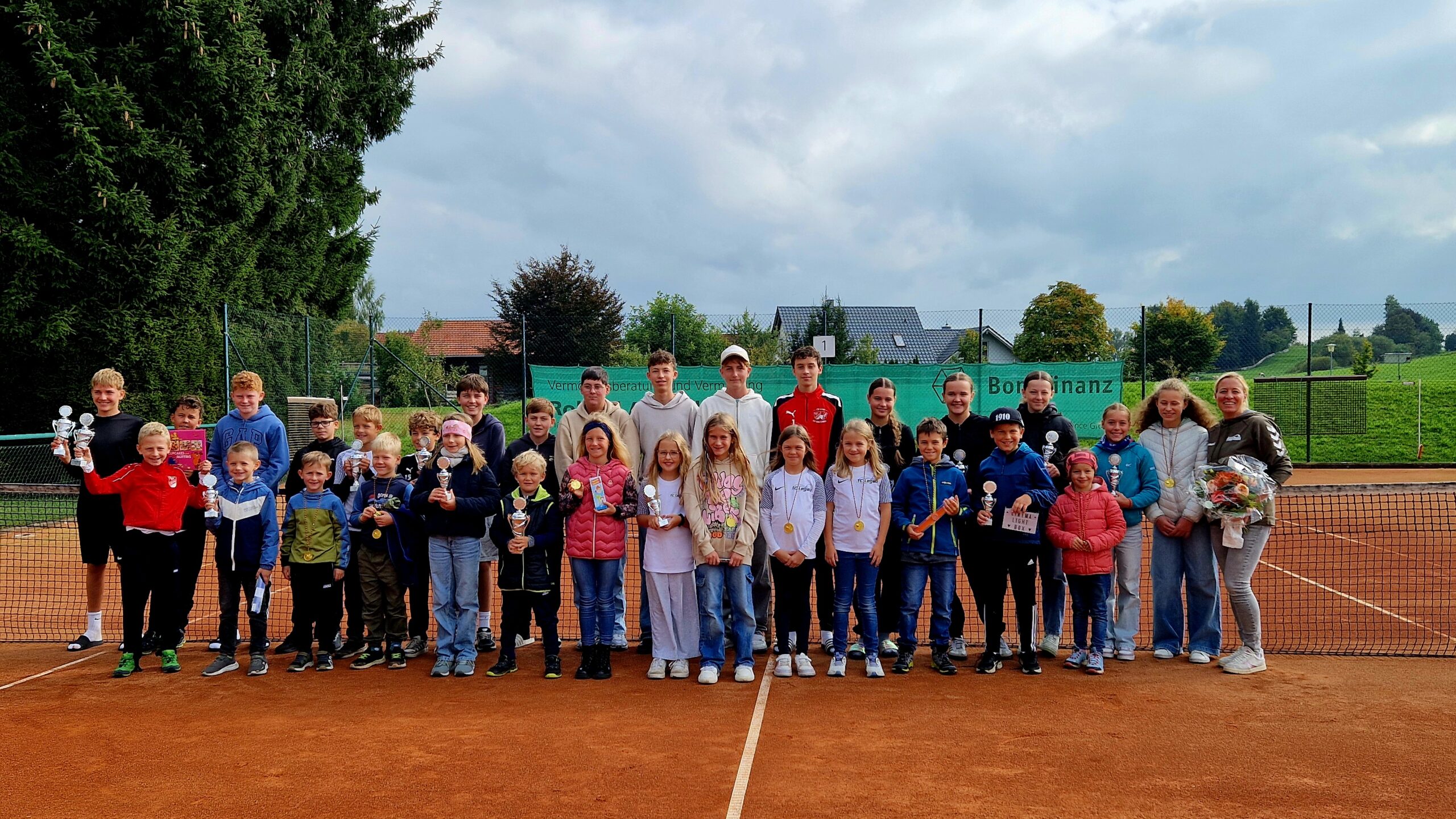 Über die Monate Juli-September spielten 39 Kinder bei den Vereinsmeisterschaften mit. Am Sonntag starteten dann unseren Kleinsten mit den Endspielen. Im Kleinfeld (U9) kämpfte Leon Hörmann gegen Vincent Bäcker und im Midcourt (U10) Samuel Schwarz gegen Moritz Ness um den Titel. Die vielen Zuschauer sahen spannende und lange Ballwechsel. Am Schluss setzte sich Vincent Bäcker mit 4:2 / 5:4 und Moritz Ness mit 4:0 / 4:1 durch und wurden Vereinsmeister. Danach ging es weiter mit unseren Mädchen und Bambini (U12). Im Cousinen-Duell spielte Lara gegen Amelie Heinle. Dort gewann Amelie mit 6:2 / 6:3. Bei den Bambini spielte Jonas Mader gegen Leopold Bäcker. Die Jungs kämpften um jeden Ball. Am Ende musste Leopold sich 6:3 / 7:5 geschlagen geben. Das Knaben Finale Linus Briechle gegen Jonas Steinle wurde leider wegen Krankheit abgesagt. Somit wurde Jonas Vereinsmeister. Bei der Siegerehrung gab es glückliche Kinderaugen als sie sich was am „Gabentisch“ raussuchen durften und natürlich einen Pokal bzw. eine Medaille bekamen. Als Dankeschön für ihr Engagement das ganze Jahr über überreichten die Kinder und Eltern unserer Jugendwartin Sonja einen Blumenstrauß, die sich sichtlich freute. Danach gab es noch eine Verlosung eines tollen Tennisrucksacks (gesponsert von Intersport Aksamit) Herzlichen Glückwunsch an alle Kinder und vielen Dank für die vielen Kuchenbäcker-Mamas und Papas.